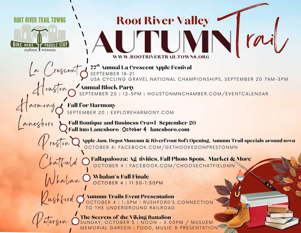 Plan to visit the Root River Trail Towns this fall on the weekends of 9/20, 9/27 and 10/4.